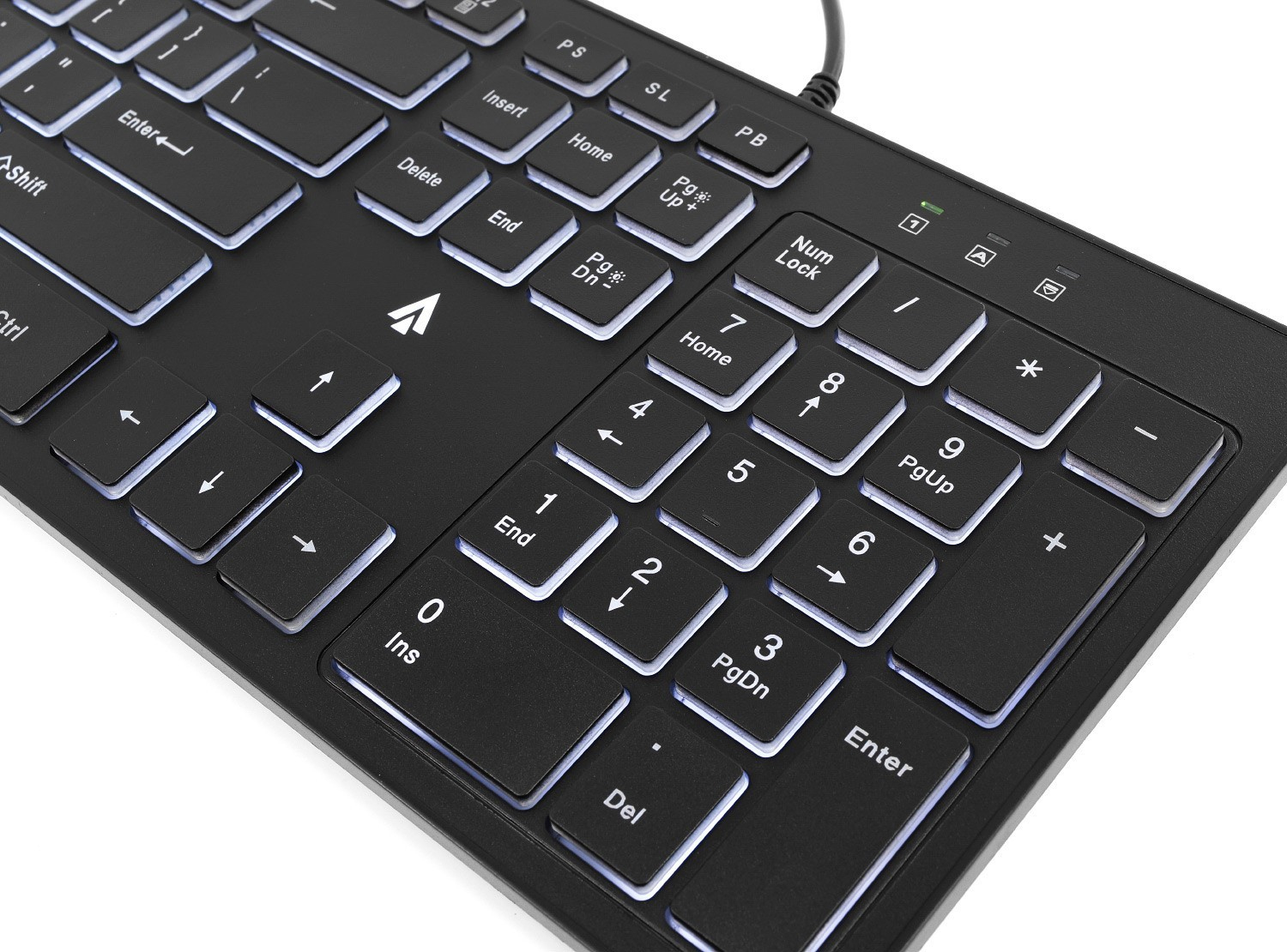 Accura Artesia ACC-K1408 to podświetlana przewodowa klawiatura do biura o klawiszach membranowych. Płaska klawiatura zajmuje niewiele miejsca i pozwala na szybkie oraz wygodne pisanie. Dzięki podświetleniu użytkownik lepiej widzi klawisze przy ograniczonym świetle zewnętrznym. Przewód USB o długości 180cm umożliwia umieszczenie klawiatury w komfortowej odległości od jednostki centralnej. System Plug&Play nie wymaga instalacji sterowników do akcesorium.